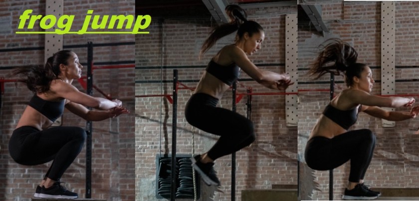 This is a combination of squatting and jumping. From a squat position, you jump straight up and land back in place in a squat, and repeat. You are only jumping up, not forward. Picture a frog jumping in place on a lily pad.